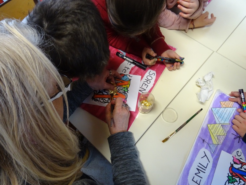 En art visuels, nous avons observé des enluminures et des vitraux. Nous avons également décoré notre initiale comme une enluminure. Jocelyne a même apporté de la feuille d’or pour que chacun puisse en mettre sur sa feuille et découvrir la technique d’application. Merci Jocelyne !!!! Nous avons également créé des vitraux avec de l’encre de différentes couleurs, coller les matelas de la princesse au petit pois et appris à dessiner un château-fort étape par étape.